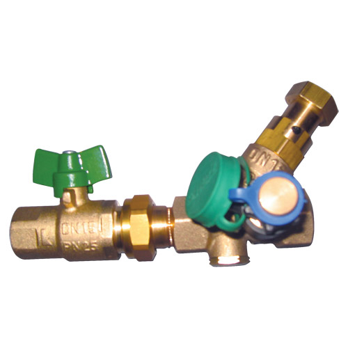 graničnik temperature cirkulacijskog voda, s kosim vretenom, žuta izvedba, s mogućnošću zatvaranja i pražnjenja, s mjernim ventilom za mjerenje tlaka prema želji, otvor s čepom. Kućište i dijelovi kroz koje protiče voda od mjedi otporne na otcinčavanje. Pladanj, sjedište ventila, zaporno vreteno, opruga i vodilice od nehrđajućeg krom nikl čelika. “O” brtve od EPDM, zdravstveno ispravnog materijala. Kolčak navoja premaISO 7/1 s kuglastom slavinom.